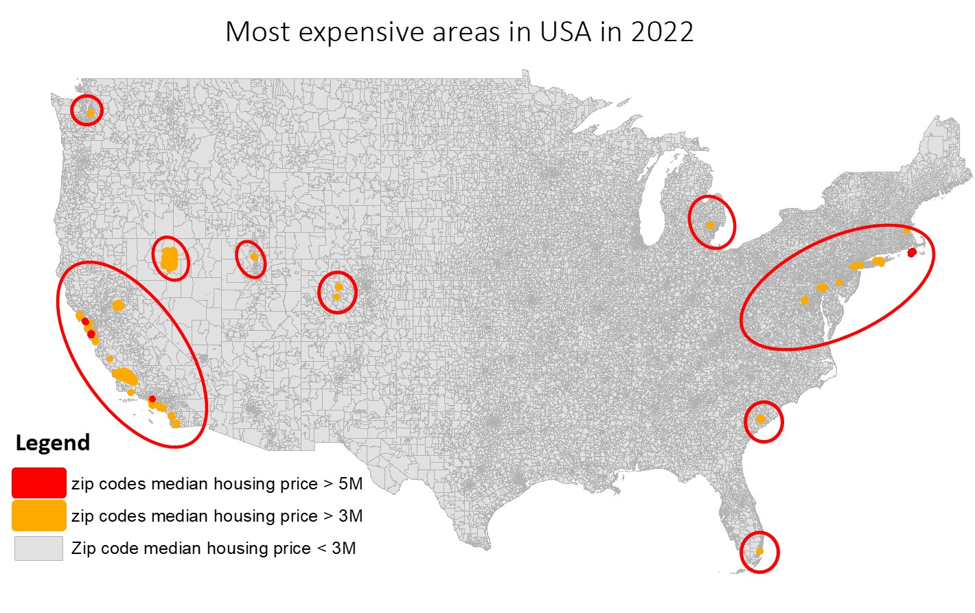 During the post pandemic years, especially 2021 and 2022, first-time home buyers, seasoned house hunters, and even veteran investors were awed by the meteoric rise of the real estate prices across the US. Do you know that median housing prices in few areas in USA were reached over $3M in 2022? Bariscope analysts looked at the sold prices across US in 2022, and found that the clusters of those highly priced housing areas are located mostly in West Coast- (California and Washington) and in east coast (Massachusetts, New Jersey, New York,Pennsylvania, Virginia, and Maryland states, South Carolina, Florida). Few sporadic areas have also been identified in upper-midwestern USA (Michigan) and in central USA (Colorado, Utah, Nevada).